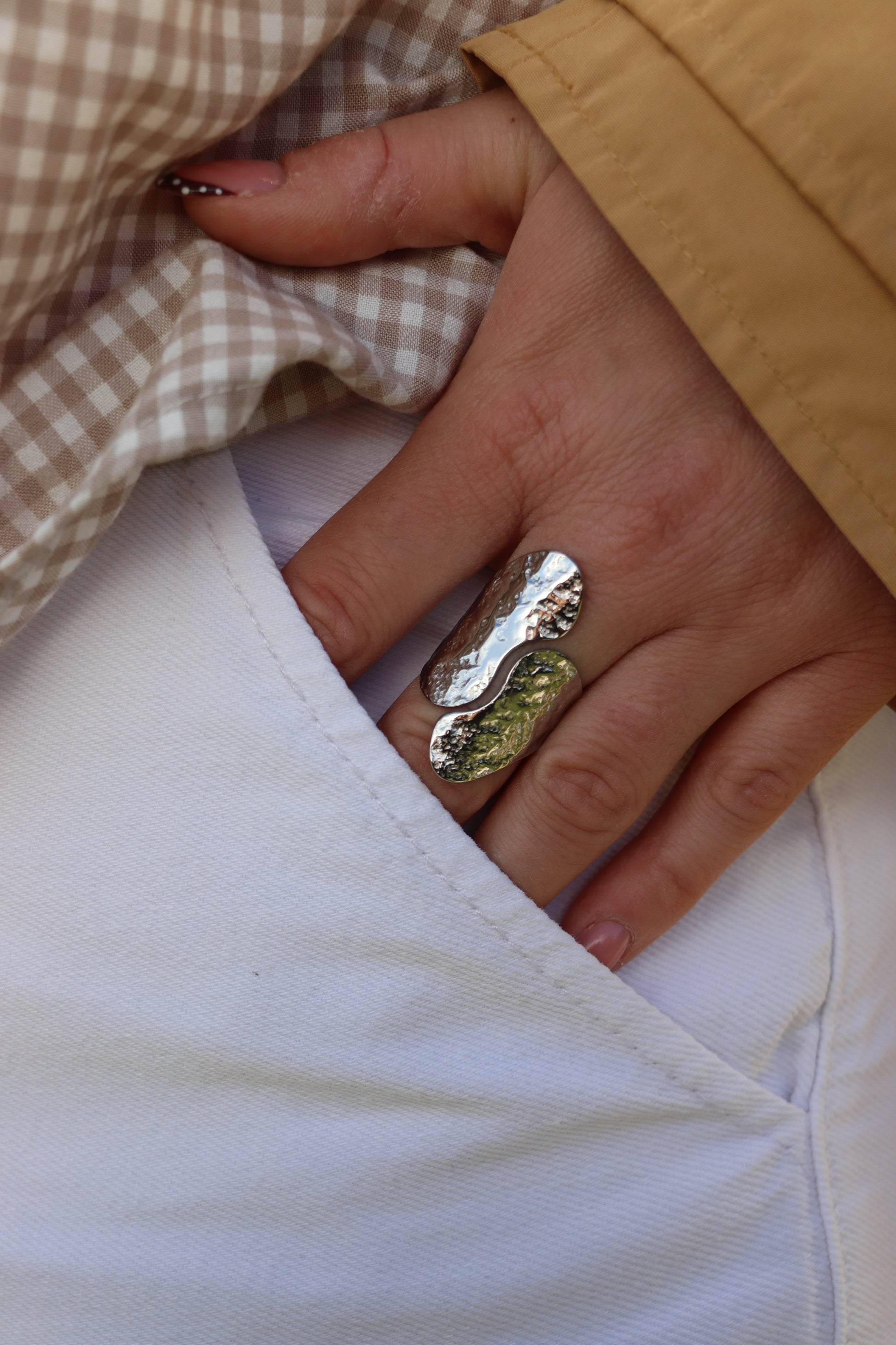 Bague argentée maximaliste au design ondulé, façonnée avec un effet martelé qui capte magnifiquement la lumière.