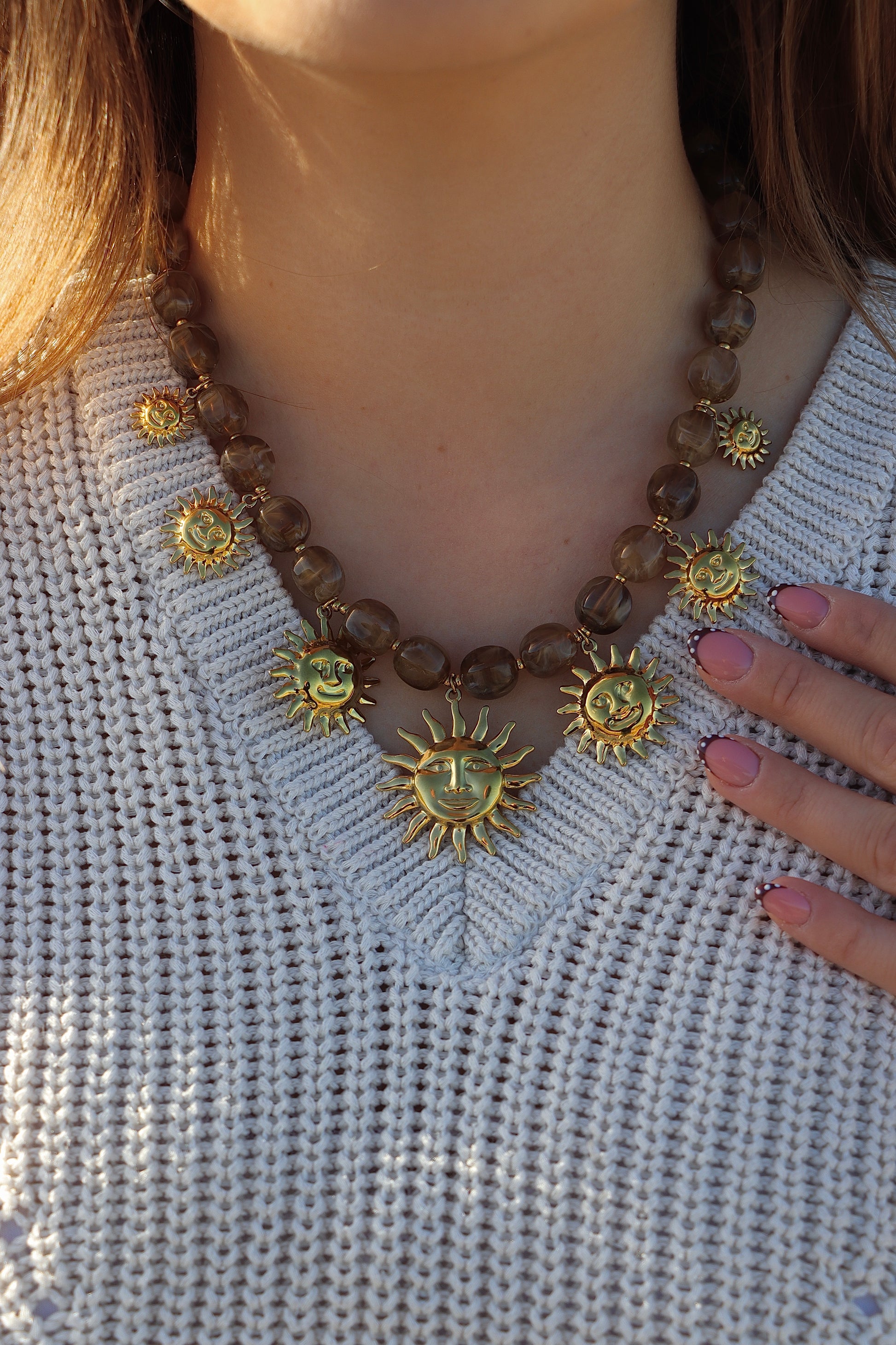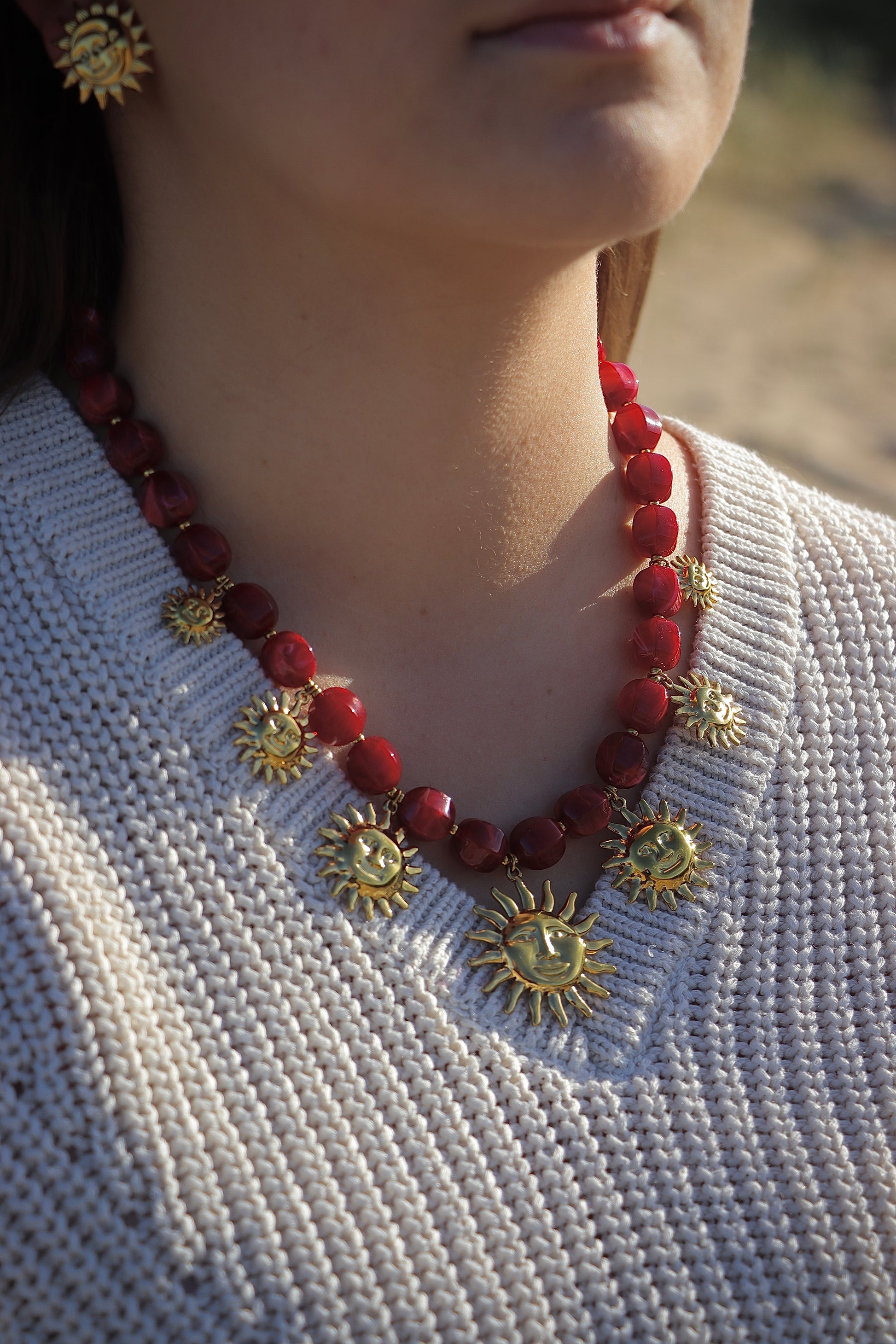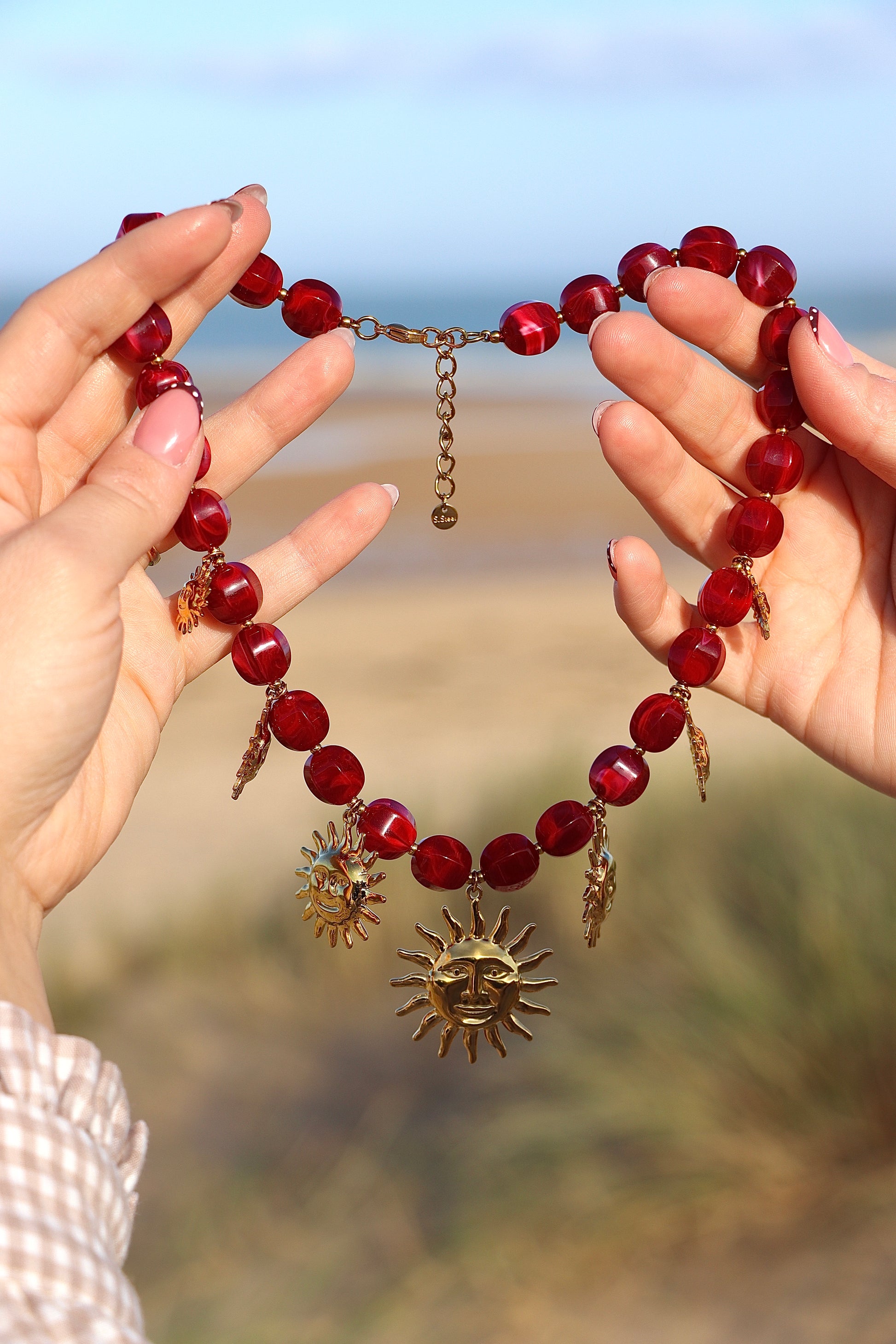 Ce collier unique associe l’élégance des perles rouges ou taupe à la chaleur des breloques soleil dorées.