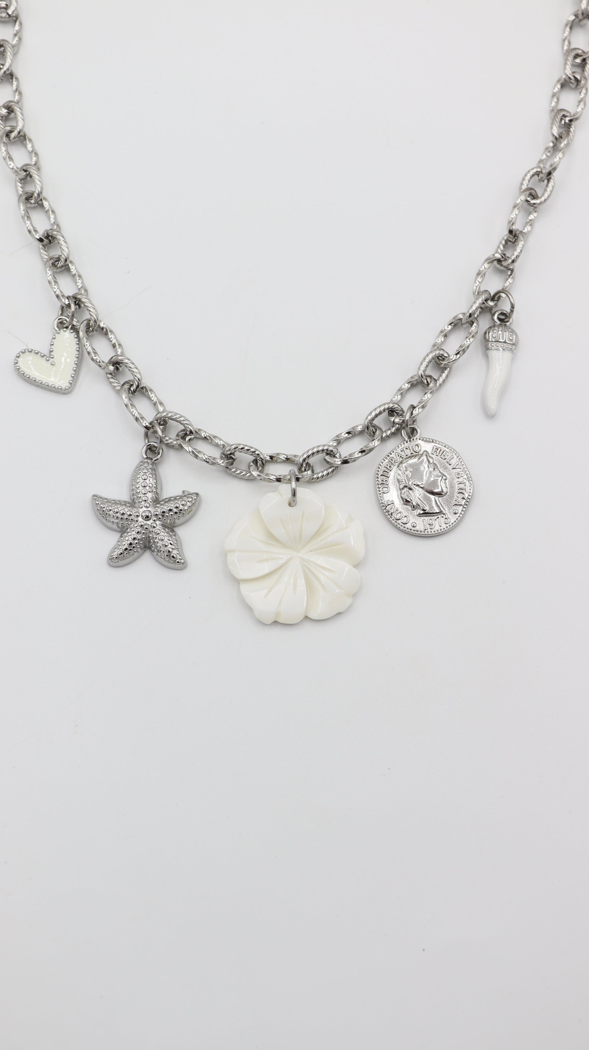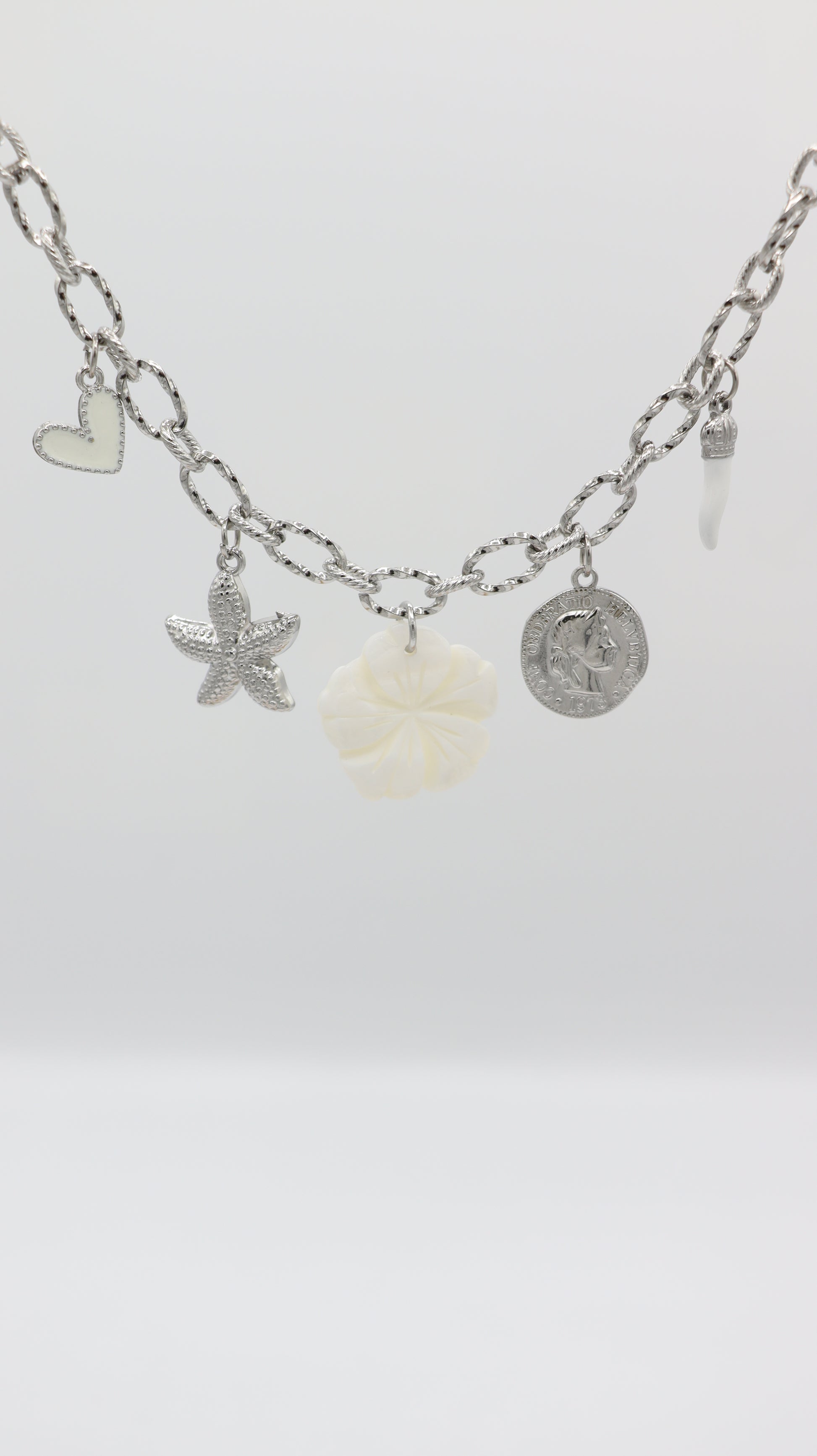 Chaîne ajustable en acier inoxydable. Charms en acier inoxydable. Il est recommandé d'éviter tout contact avec l'eau et de sécher délicatement les charms après exposition à l'humidité.
