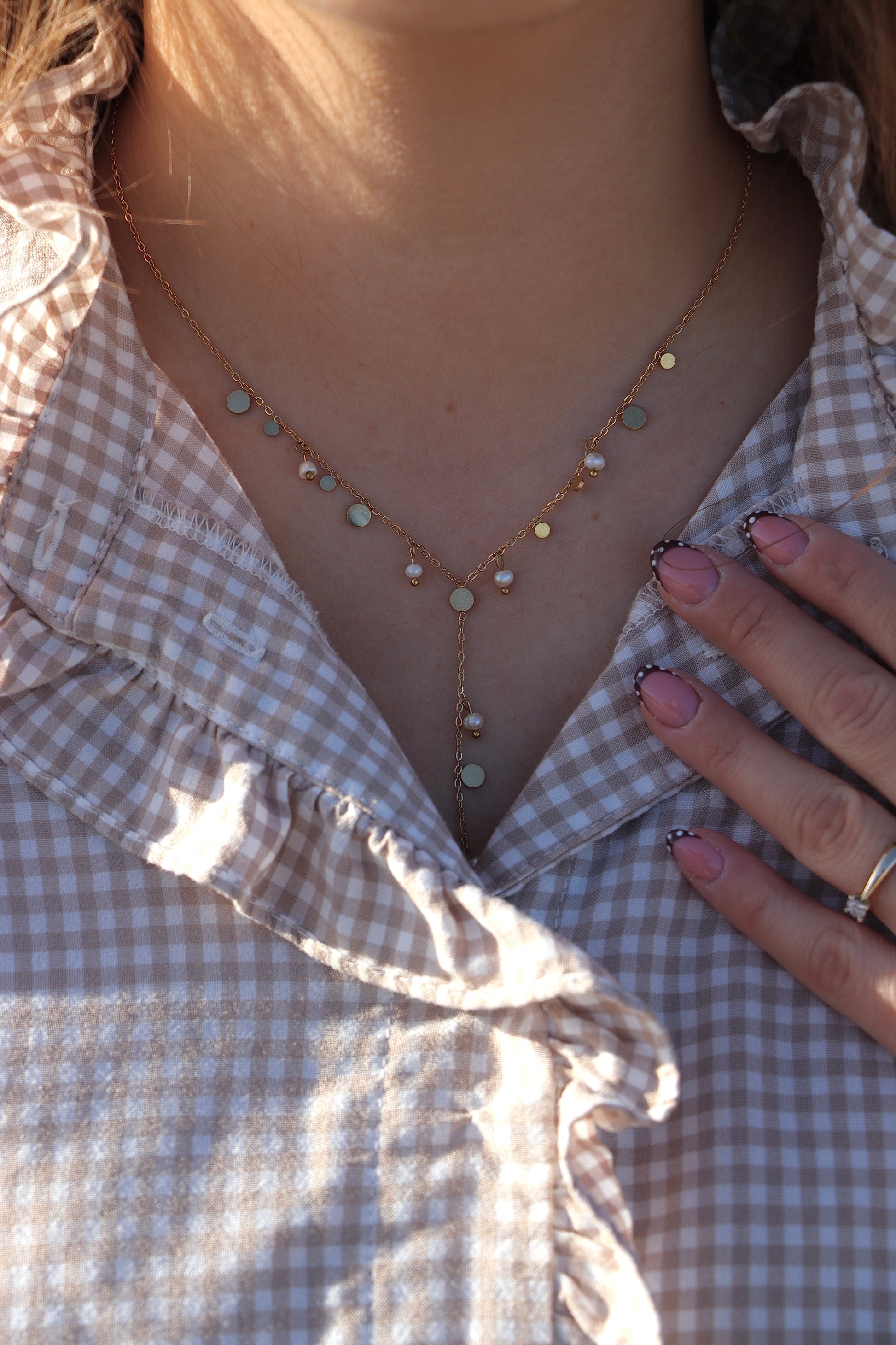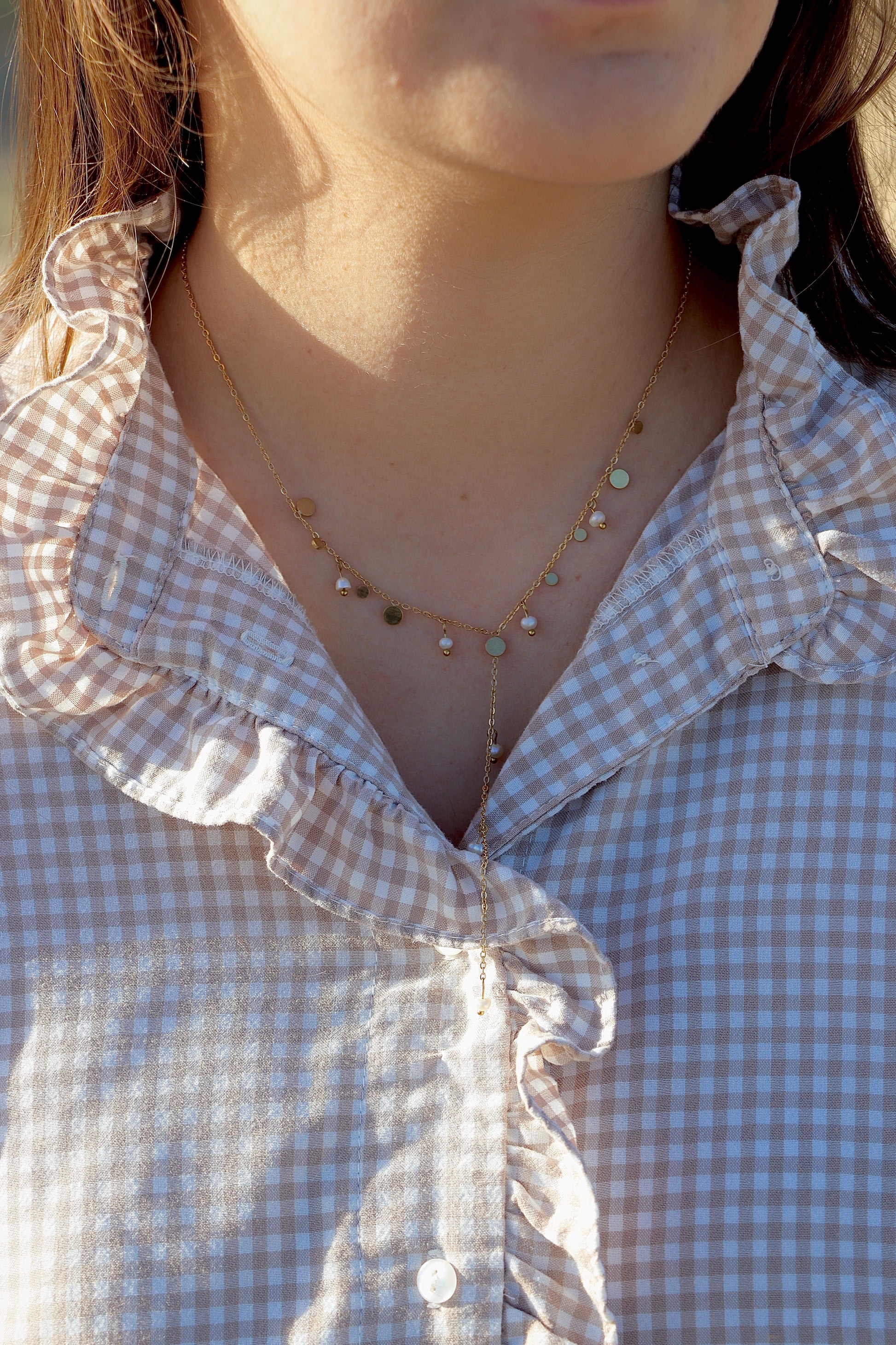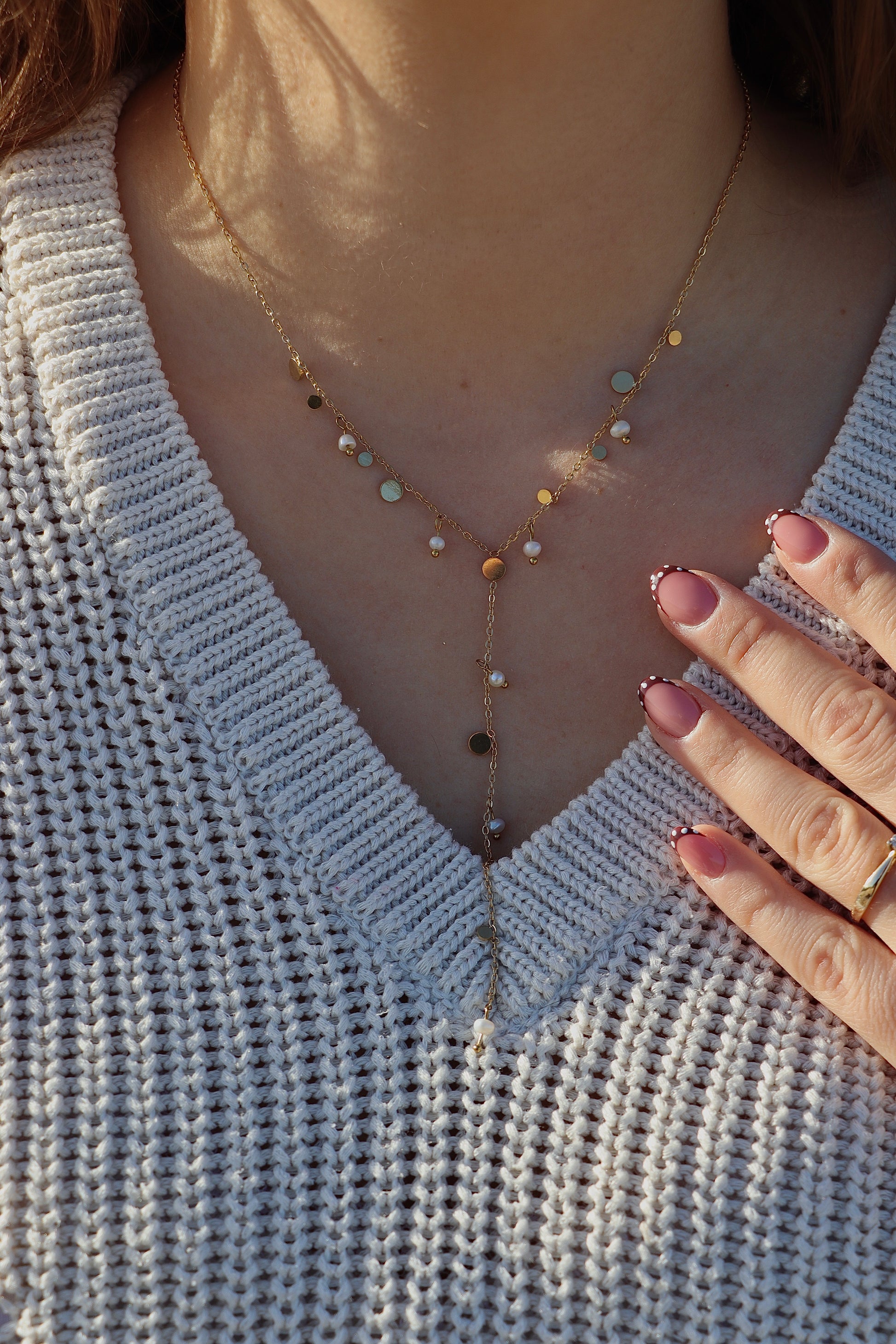 Ce collier Elena, en Y allie délicatesse et élégance, avec de petites perles blanches scintillantes et des pampilles dorées raffinées.