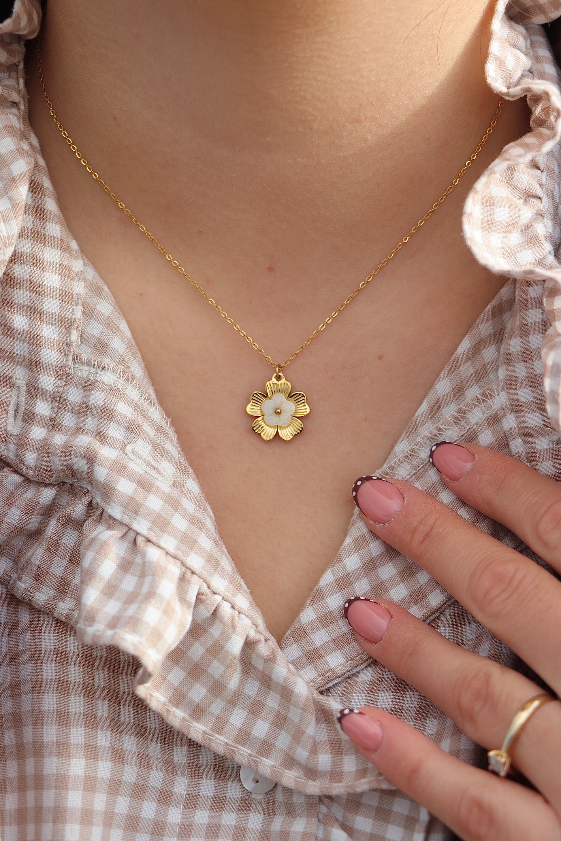 Ce collier fin révèle un pendentif double fleur alliant un support doré délicatement travaillé à une fleur nacrée blanche posée au-dessus.