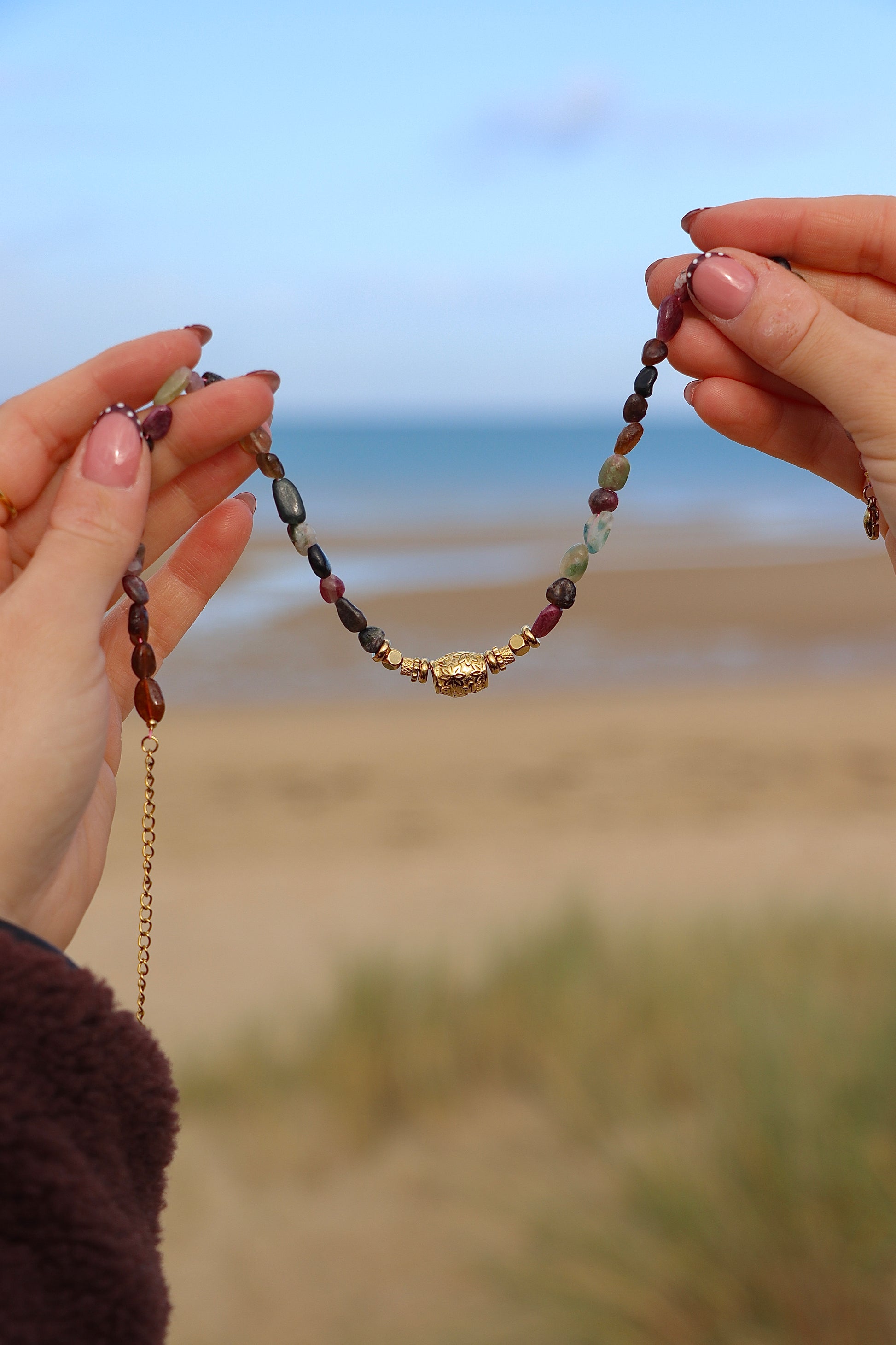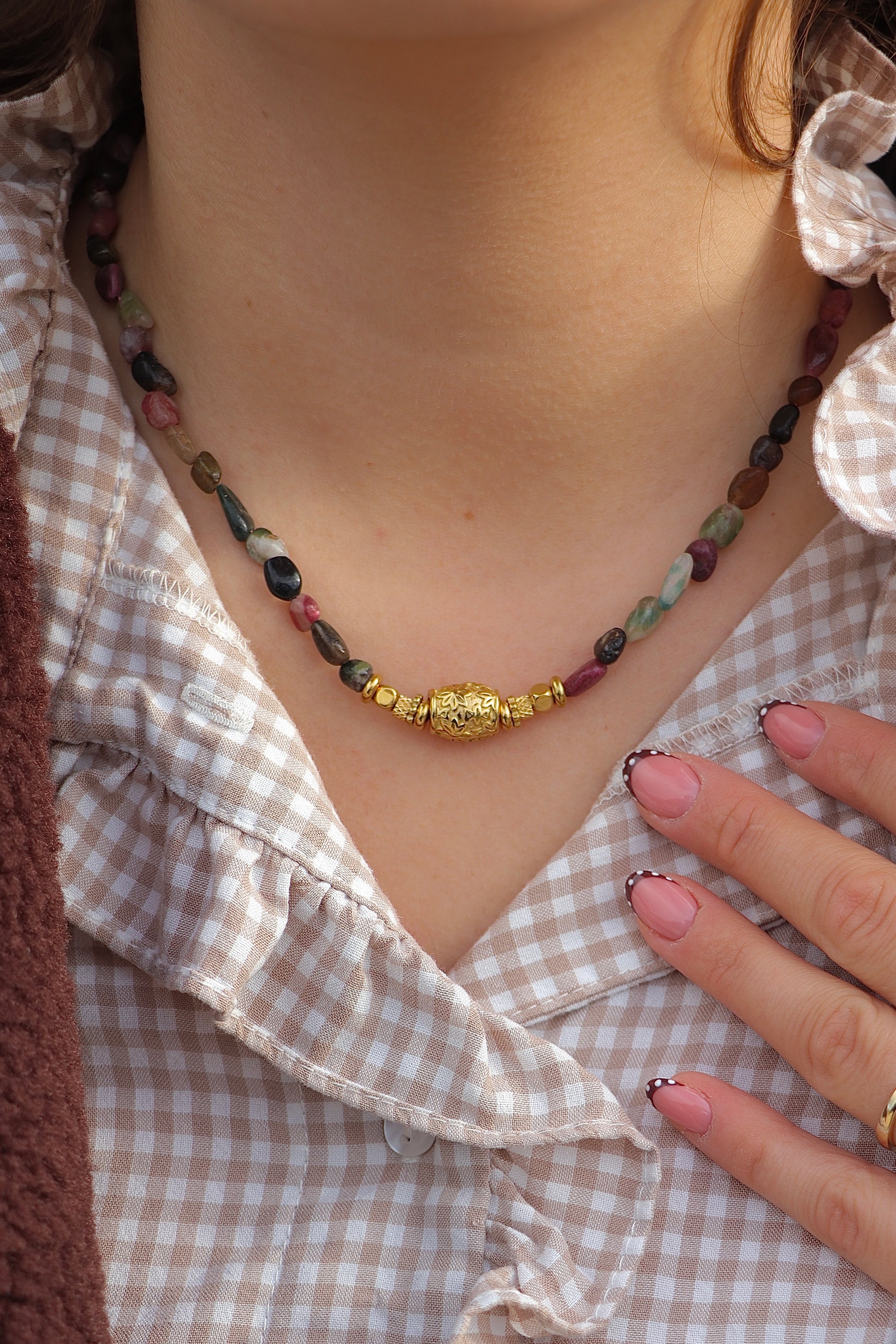 Découvrez un collier d’exception composé de pierres naturelles soigneusement sélectionnées pour leurs couleurs chaleureuses et leurs reflets uniques : beige/marron et automnal/bordeaux, noir et vert.