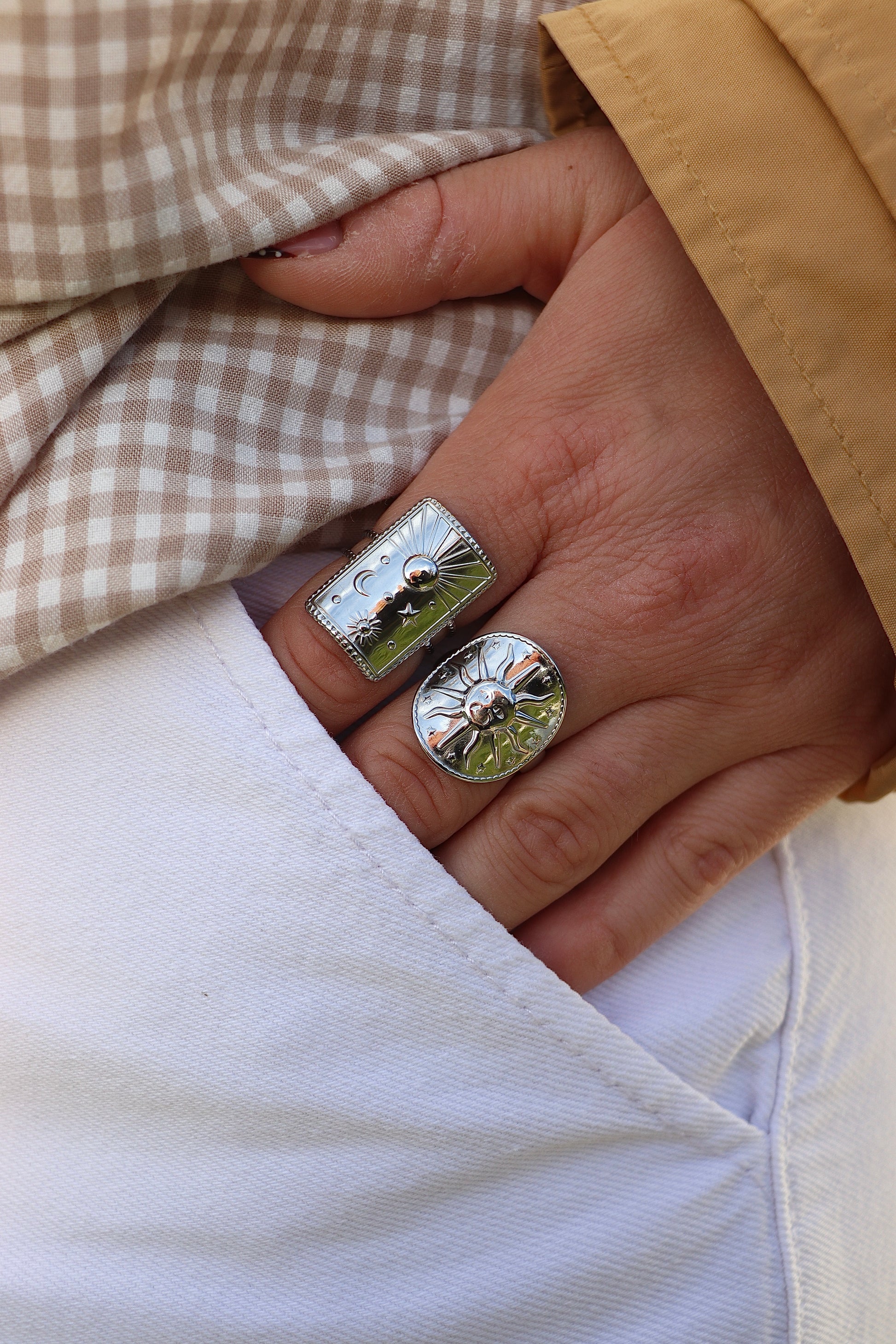 Bague argentée ornée d’un soleil en relief, un symbole lumineux qui attire le regard avec douceur.