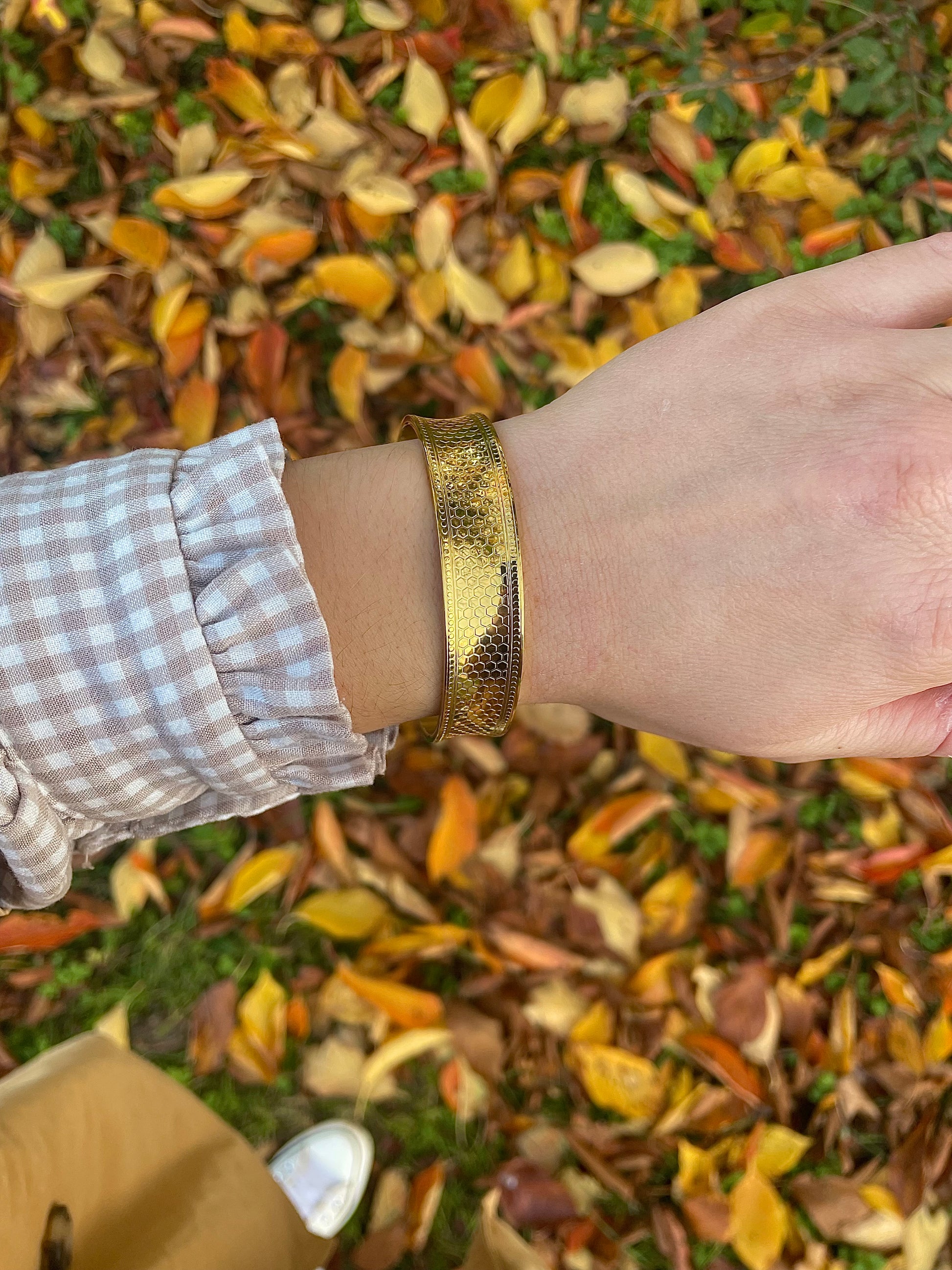 Grâce à sa brillance dorée et à ses reliefs travaillés, ce jonc capte la lumière et sublime instantanément le poignet. Il se porte seul pour un look affirmé, ou associé à d’autres bracelets pour un style plus tendance et superposé.