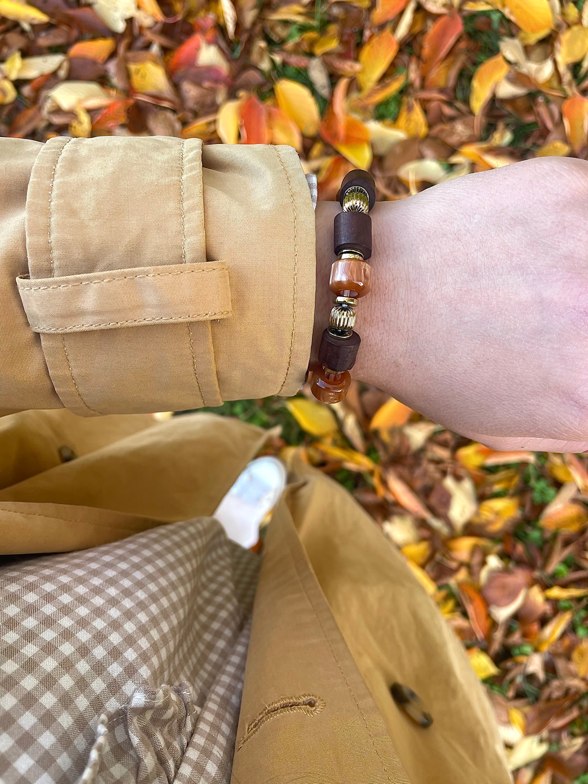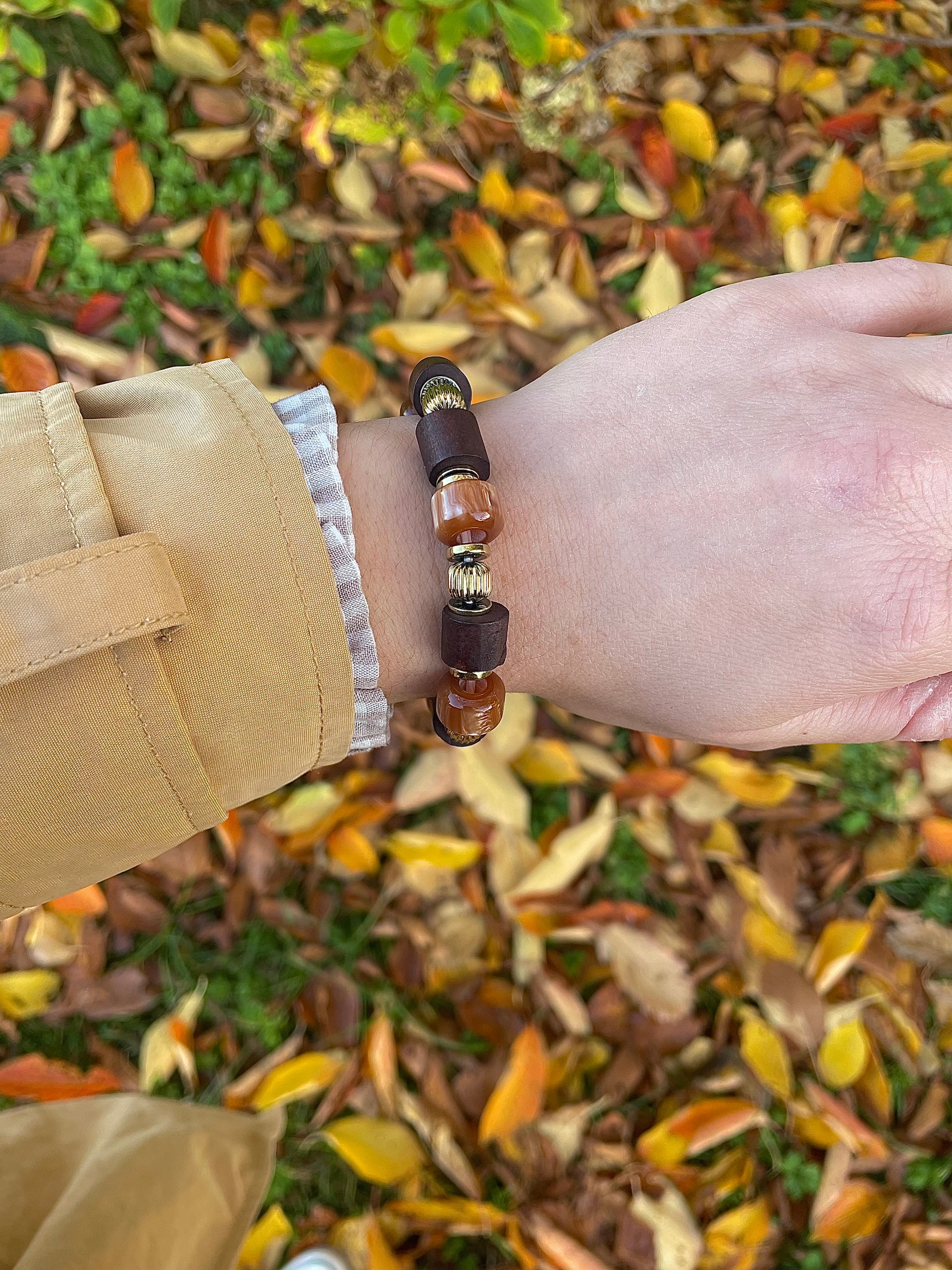 Composé de perles doré orangé mêlées à des perles en bois, il dégage une véritable atmosphère automnale.