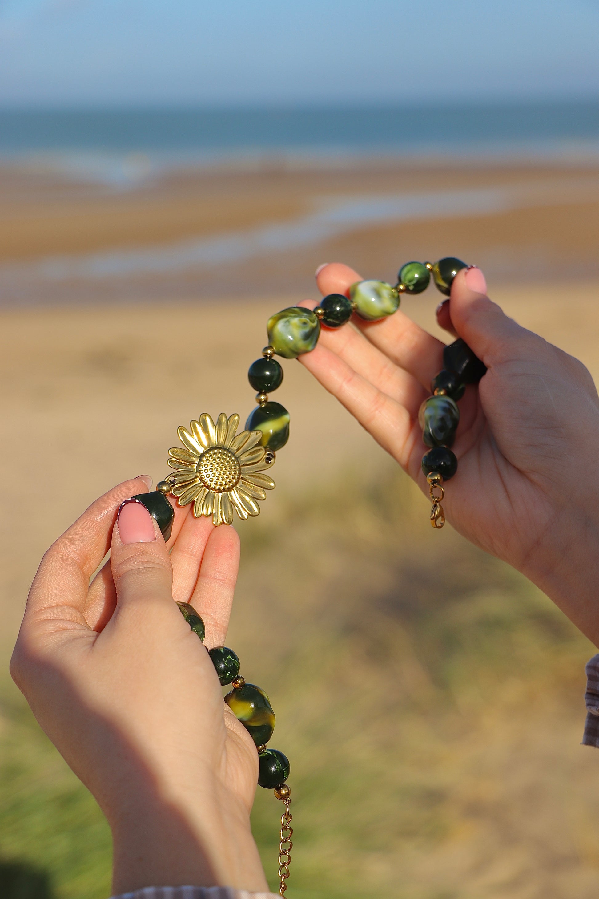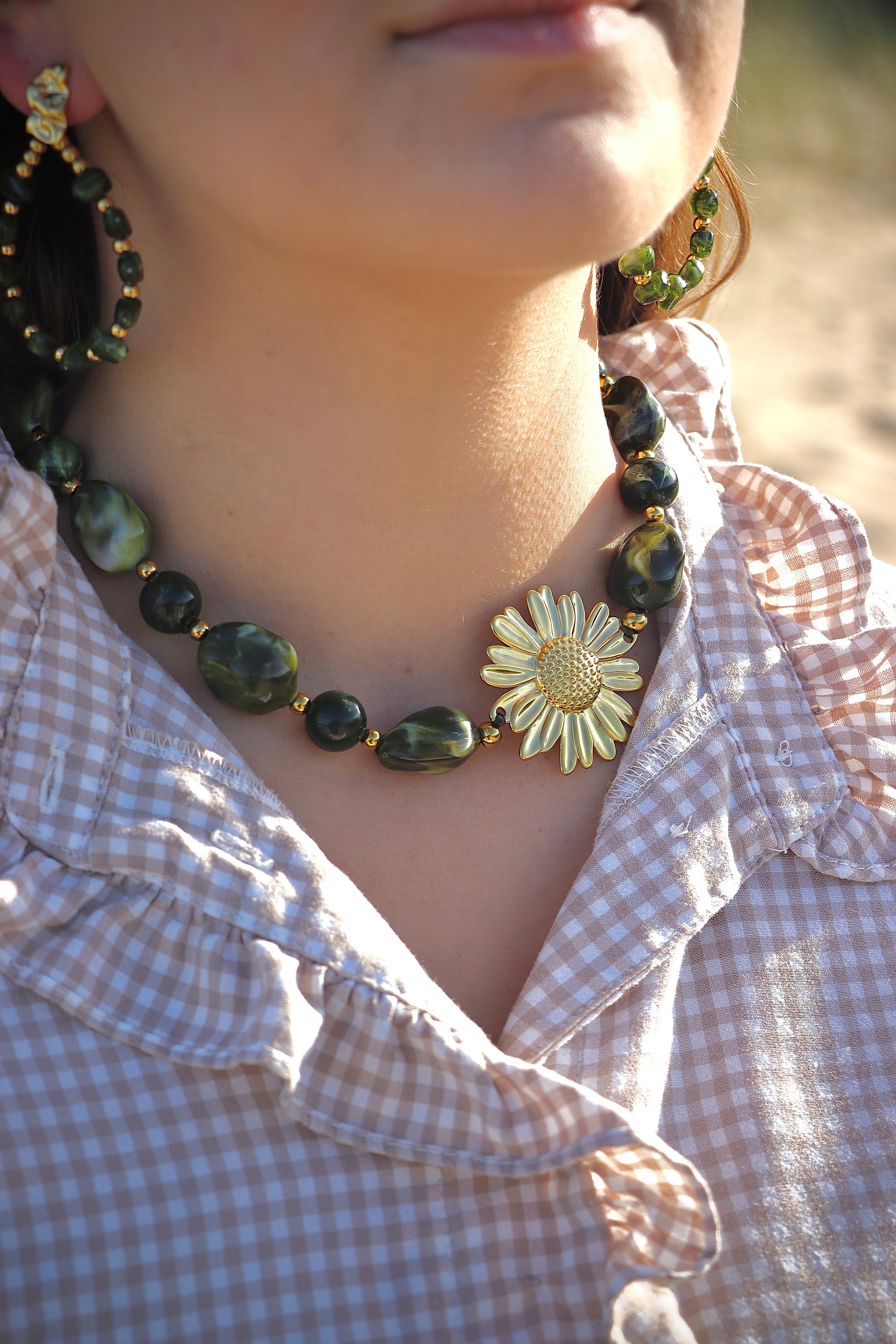 Orné de grosses pierres vertes aux formes et nuances variées, il attire le regard par son éclat et son originalité.