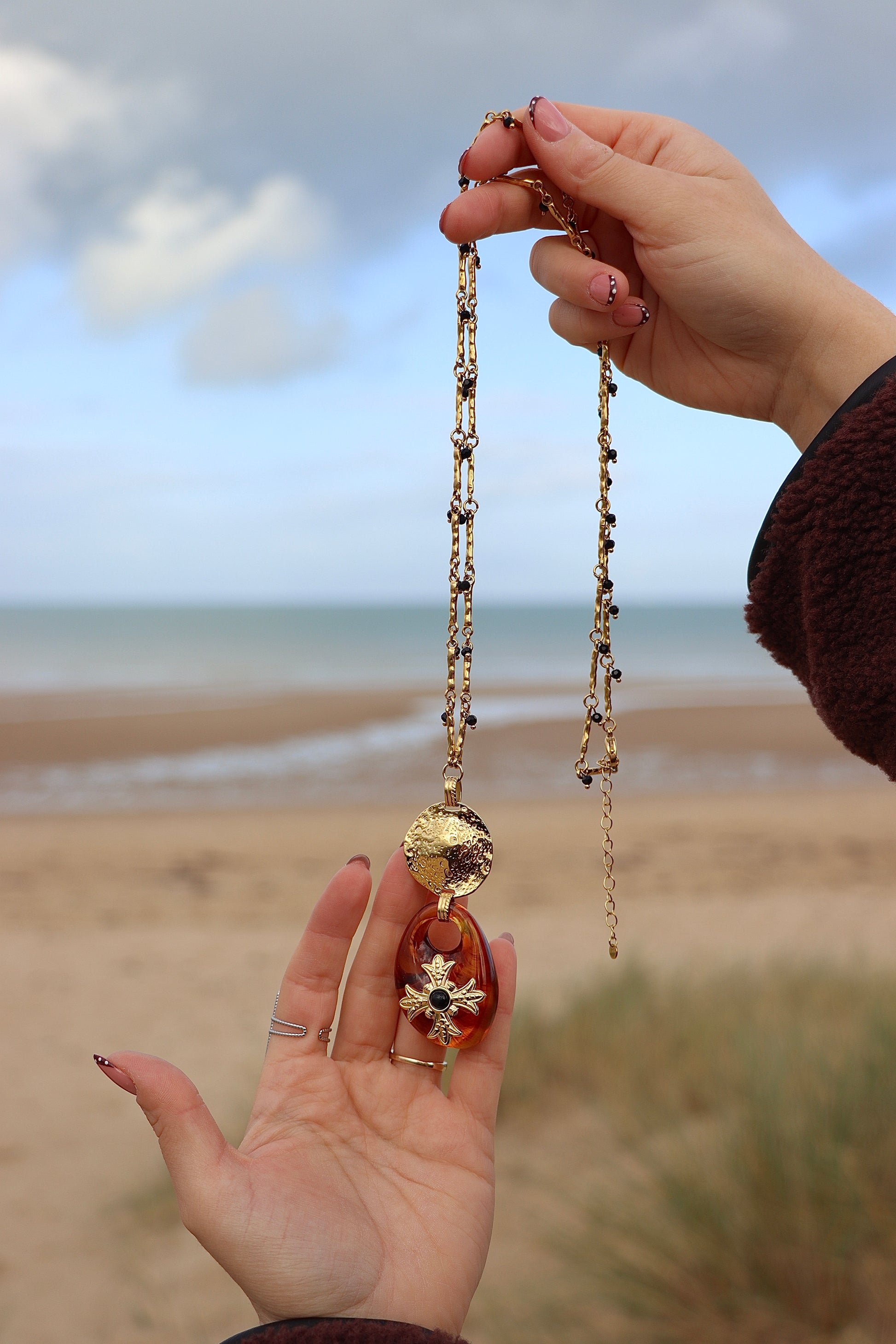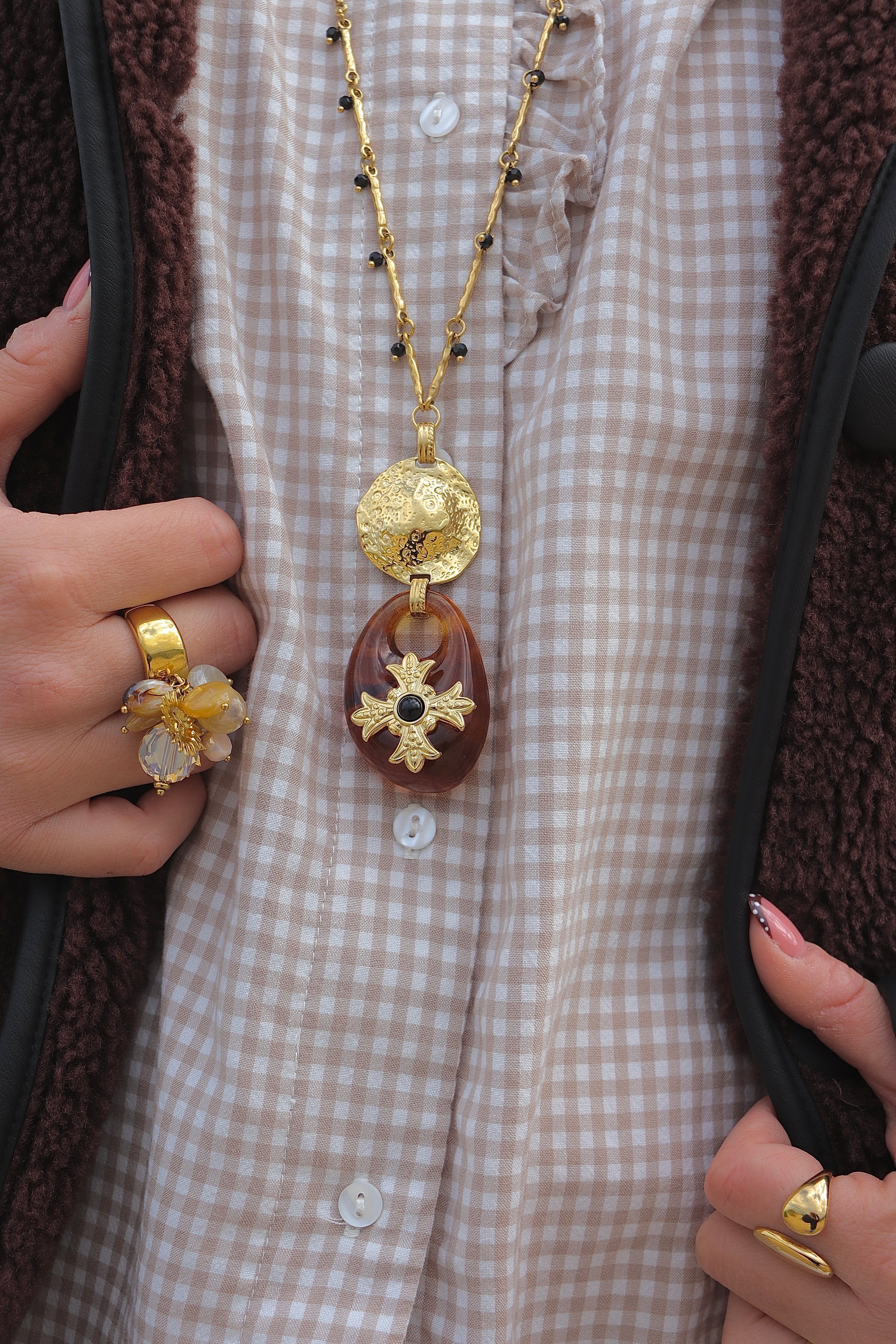 Son pendentif généreux en résine marron, apporte profondeur et caractère, tout en laissant transparaître des nuances chaleureuses.