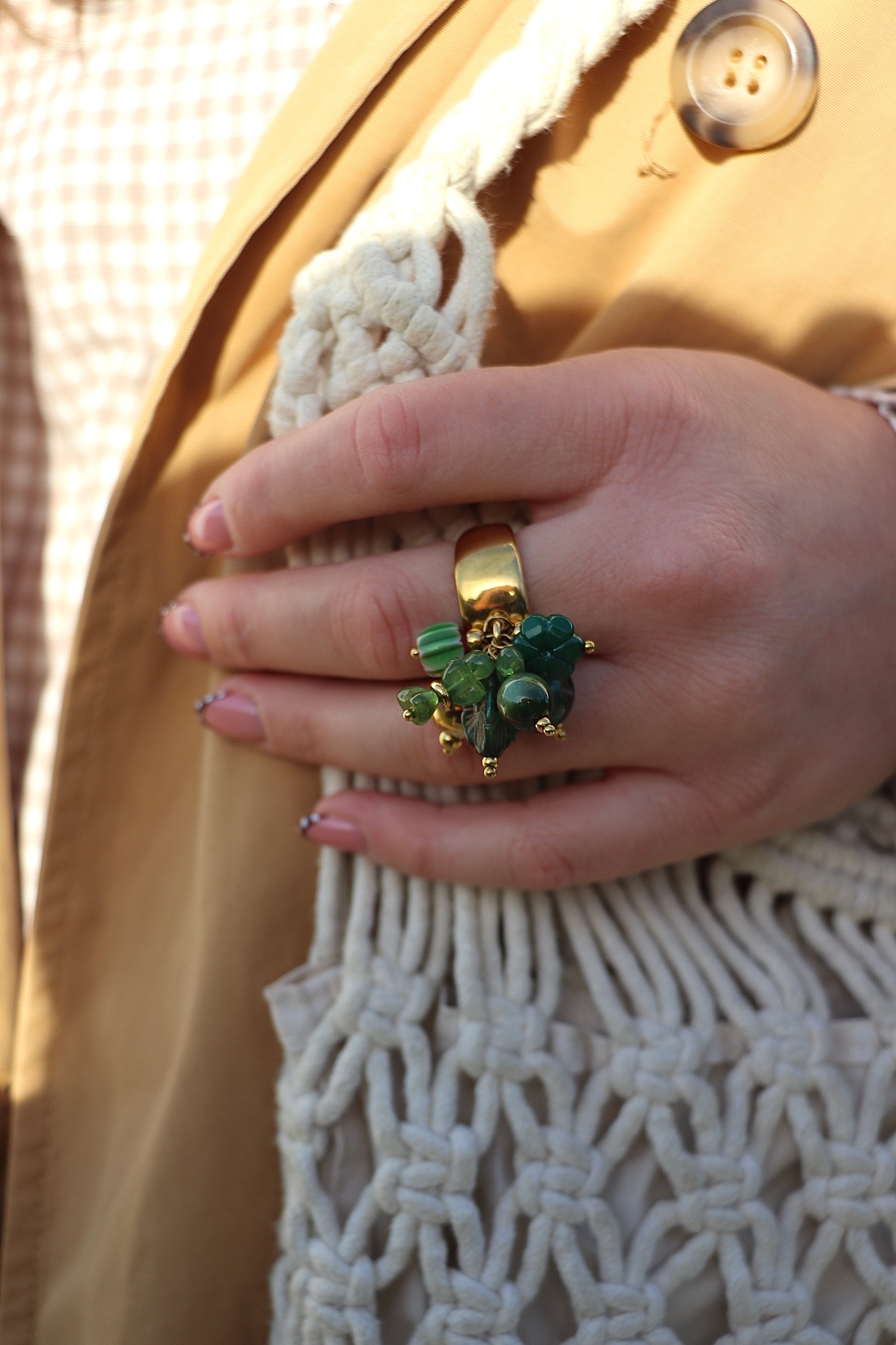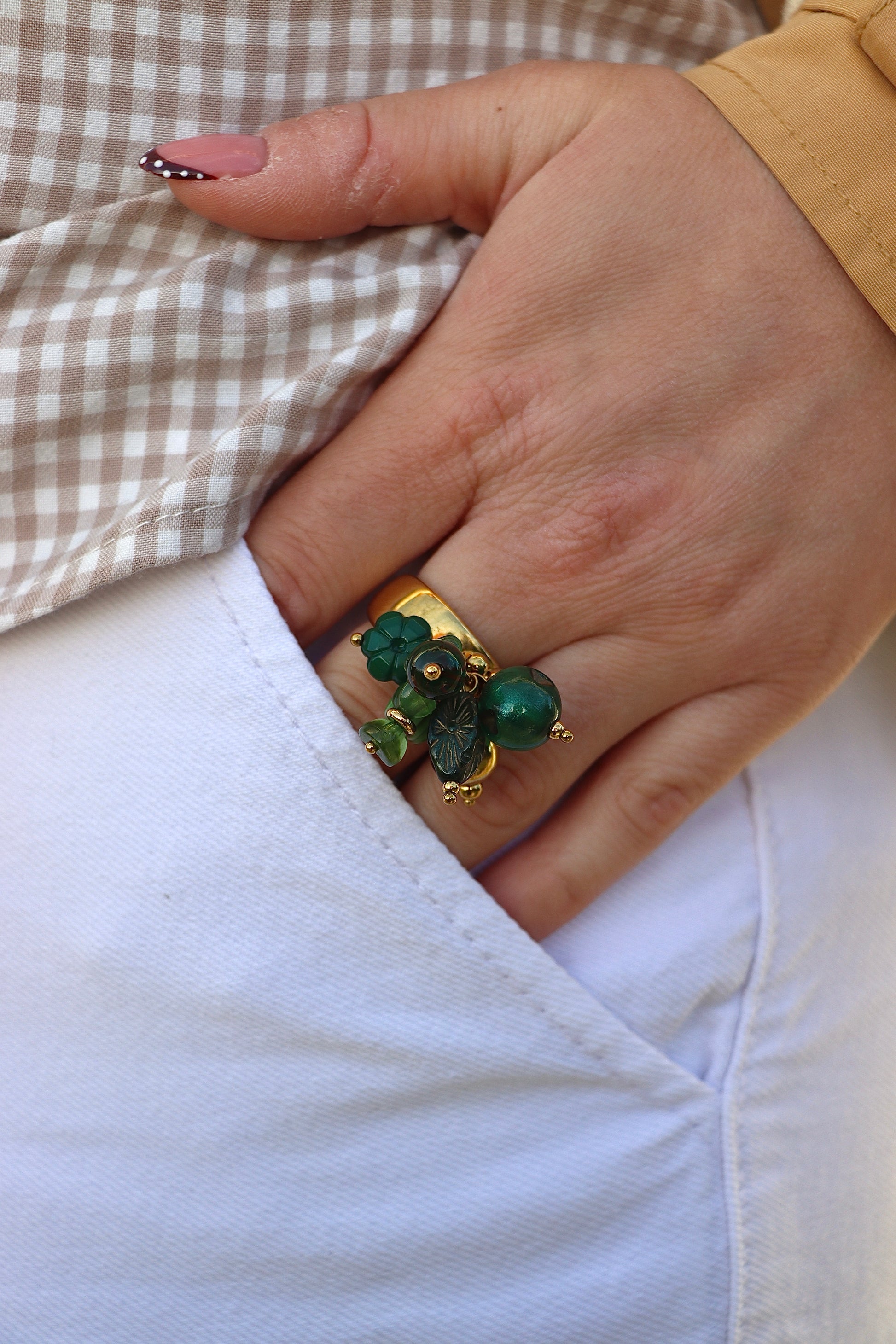 Bague élégante ornée de plusieurs breloques dans des tons verts, créant un jeu de couleurs chaleureux et raffiné.